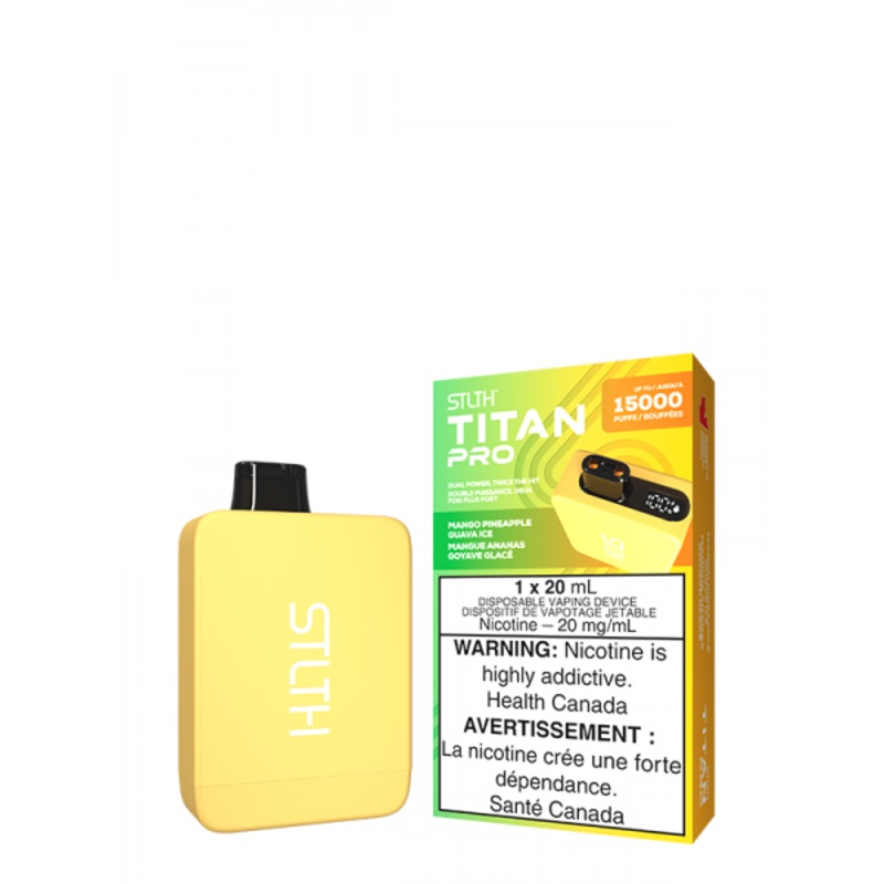 Mango Pineapple Guava Ice STLTH TITAN PRO Disposable (Carton of 5 Units) A tropical blend of sweet mango, tangy pineapple, and exotic guava with a refreshing icy finish. ______ STLTH TITAN - DUAL POWER - TWICE THE HIT - WITH LED SCREEN 1 carton contains 5D