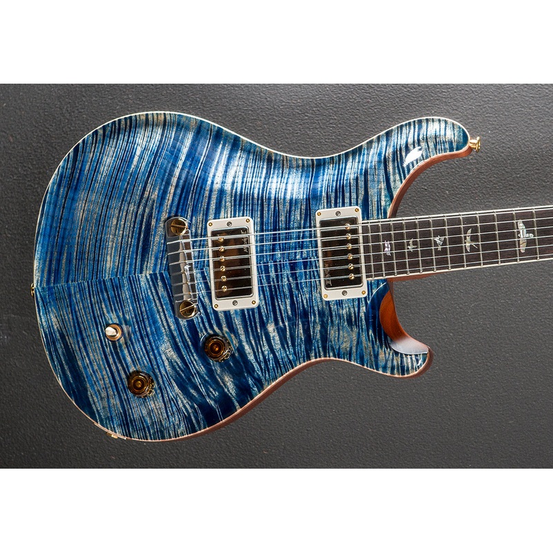 Faded Blue Jean, High gloss nitro finish, Violin carved Flame Maple 10 top, Mahogany body, Pattern carved Mahogany neck, 10″ radius Rosewood fingerboard with the Bird inlays and faux bone binding, 25 scale length, 1 11/16th nut, PRS McCarty III bridge and neck pickups, 3-way toggle switching with the volume and push/pull coil tap tone controls, PRS stoptail bridge with the brass inserts, PRS Phase III non-locking tuners with the wing buttons, 7.6 pounds, With hardshell case