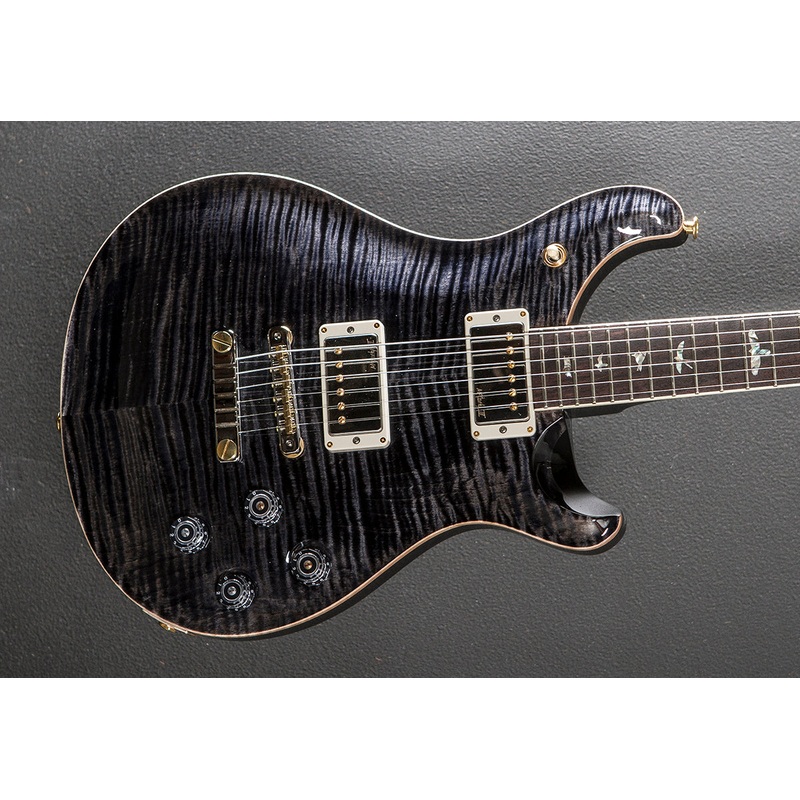 Gray Black, High gloss nitro finish, Violin carved Flame Maple 10 top, Mahogany body, Pattern Vintage carved Mahogany neck, 10 radius Rosewood fingerboard with the Bird inlays and faux bone binding, 24.594 scale length, 1 11/16th nut width, PRS McCarty III bridge and neck pickups, 3-way toggle switching with the volume and push/pull coil tap tone controls for each pickup, PRS two-piece bridge, PRS Phase III non-locking tuners with the wing buttons, 8.0 pounds, With hardshell case