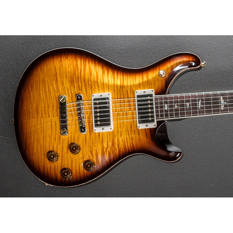 McCarty Tobacco Sunburst, High gloss nitro finish, Violin carved Flame Maple 10 top, Mahogany body, Pattern Vintage carved Mahogany neck, 10 radius Rosewood fingerboard with the Bird inlays and faux bone binding, 24.594 scale length, 1 11/16th nut width, PRS McCarty III bridge and neck pickups, 3-way toggle switching with the volume and push/pull coil tap tone controls for each pickup, PRS two-piece bridge, PRS Phase III non-locking tuners with the wing buttons, 8.2 pounds, With hardshell case
