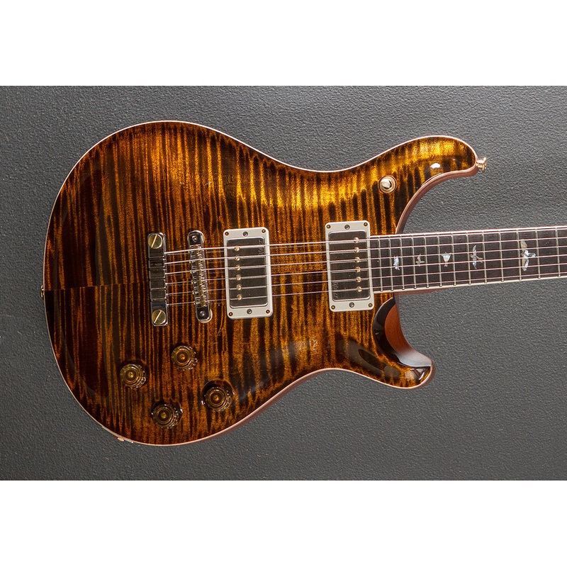 Yellow Tiger, High gloss nitro finish, Violin carved Flame Maple 10 top, Mahogany body, Pattern Vintage carved Mahogany neck, 10 radius Rosewood fingerboard with the Bird inlays and faux Bone binding, 24.594 scale length, 1 11/16th nut width, PRS 58/15 LT bridge and neck pickups, 3-way toggle switching with the volume and push/pull coil tap tone controls for each pickup, PRS two-piece bridge, PRS vintage style non-locking tuners with the wing buttons,8.2 pounds, With hardshell case