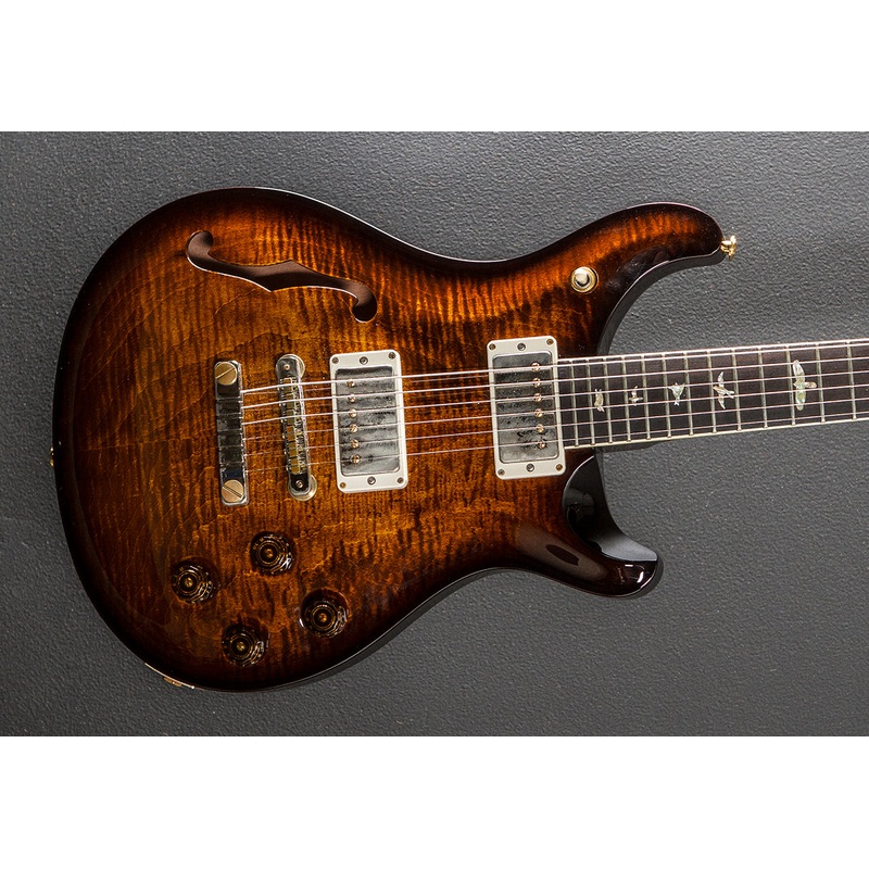 Black Gold Burst Wraparound, Violin carved Flame Maple 10 top with the single F hole, Semi-hollow Mahogany body, Pattern Vintage carved Mahogany neck, 10 radius Rosewood fingerboard with the Bird inlays and faux Bone binding, 24.594 scale length, 1 11/16th