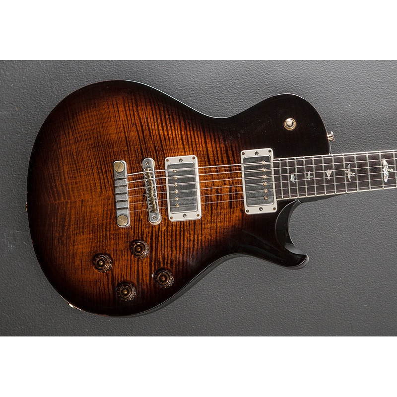Black Gold Burst Wraparound, Gloss finish,Violin carved Flame Maple 10 top, Mahogany body, Pattern Vintage carved Mahogany neck, 10 radius Rosewood fingerboard with the Bird inlays and faux bone binding, 24.594 scale length, 1 11/16th nut width, PRS 58/15L