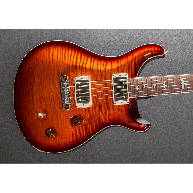 Dark Cherry Sunburst, Violin carved Flame Maple 10 top, Mahogany body, Pattern carved East Indian Rosewood neck, Bound 10 radius Brazilian Rosewood fingerboard with the Gold Mother of Pearl outlined White Mother of Pearl Bird inlays, Brazilian Rosewood hea