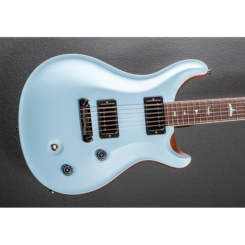 Powder Blue, Satin body finish, Violin carved select Maple top, Mahogany body, Pattern carved East Indian Rosewood neck, Bound 10 radius Brazilian fingerboard with the Paua outlined Mother of Pearl Bird inlays, Brazilian Rosewood headstock veneer, 25 scale