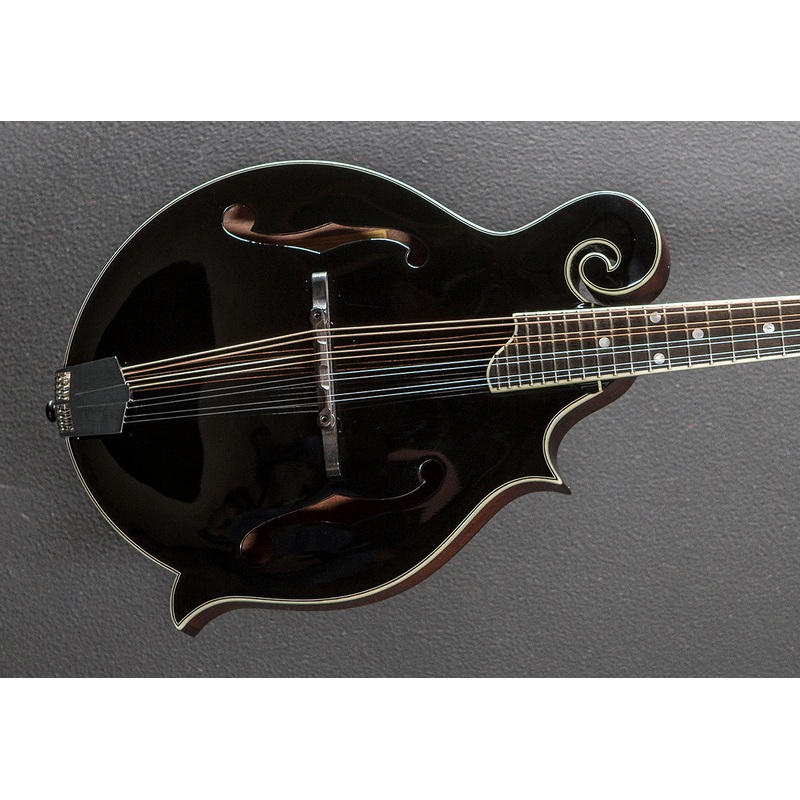 Black top, Gloss finish, F body shape, Solid Spruce top with the F holes, Solid Mahogany back and sides, Ivoroid binding, Bound 12 radius Ebony fingerboard with the pearl dot inlays on a Maple neck, 13 7/8th scale length, 1 3/32nd nut width, Adjustable com