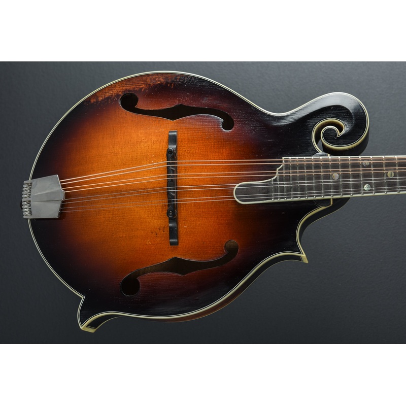 Sunburst, Antique varnish finish,F body shape, SolidAdirondack Spruce top with the F holes, Solid Flame Maple back and sides, Ivoroid binding, Bound 12" radius Ebony fingerboard with the Pearl Dot inlays on a Maple neck, 13 7/8th" scale length, 1 3/32nd" n