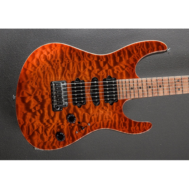 Transparent Orange Burst, Gloss body finish, Quilt Maple top with the scraped binding, Basswood body, Modern Elliptical (.78 to .83) shaped roasted 4A Birdseye Maple neck with a 16″ radius roasted 4A Birdseye Maple fingerboard and stainless steel jumbo frets, 25.5″ scale length, 1.650″ nut width, JST SSH+ bridge/ML middle/SSV neck pickups, 5-way switching with the master volume and push/pull coil tap tone controls plus the push button blower switch, Gotoh 510 two-post tremolo with the block steel saddles and the added Tremol-No, Hipshot locking tuners, 7.4 pounds, With hardshell case, Very good