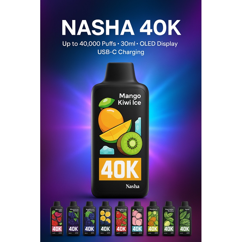 TheNasha 40K Disposableoffers premium performance with up to 40,000 puffs and a generous 30ml e-liquid capacity. Featuring a 0.6 dual mesh coil for intense flavour and a powerful 1000mAh rechargeable battery, this device ensures long-lasting satisfaction. The built-in OLED display conveniently shows battery life and e-liquid levels, while the child lock and leak-proof technologyprovide safety and reliability. Users can switch between three adjustable power modes, reaching up to 21W, to customize their vaping experience. Each carton contains five devices.