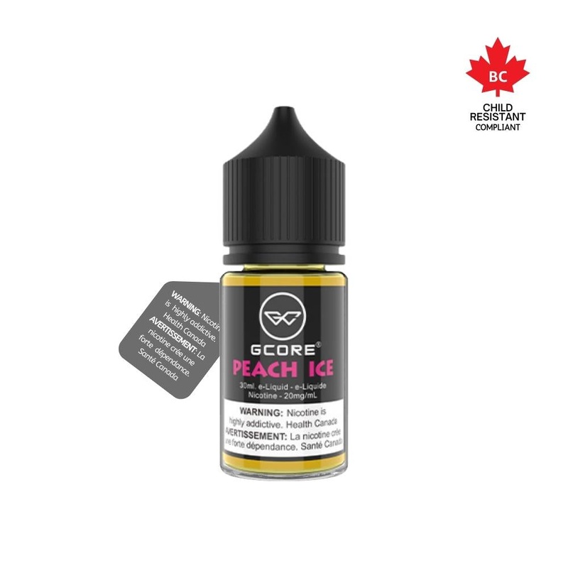 Peach Ice by GCORE Salt is a nic salt e-juice that combines the flavors of peach and mint. This product is packaged in a 30mL bottle and is intended for adult users. The formulation provides an option for those seeking a specific vaping experience.