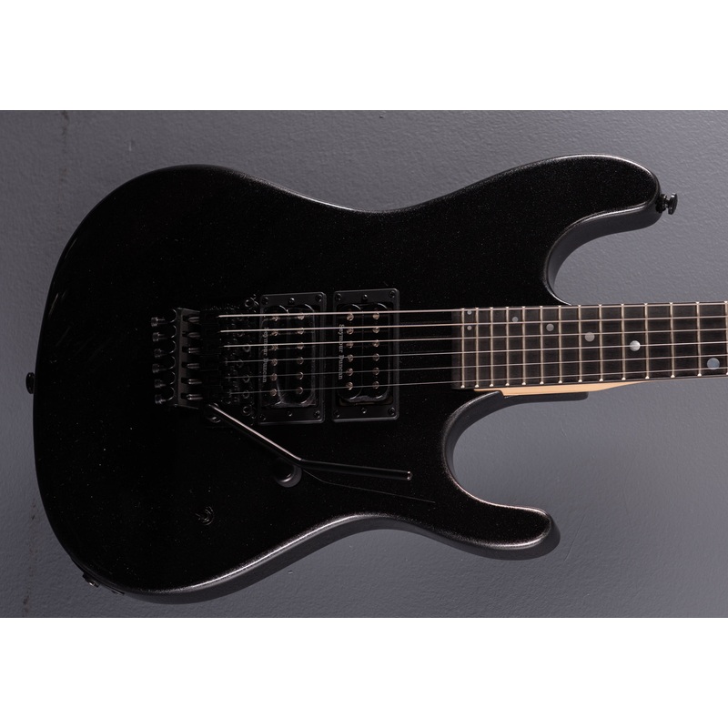 Jet Black Metallic, Mahogany body, 16 radius Ebony fingerboard with the White Pearloid Dots inlays and Medium Jumbo frets on a C-Shaped Maple neck, 24.75 scale length, 1.63″ (41.28mm) nut width, Seymour Duncan JB bridge and middle pickups with 3 way mini toggle switching, Floyd Rose 1000 Series Tremolo bridge, Kramer Deluxe 14:1 Ratio tuners, 7.1 pounds, Case not included.