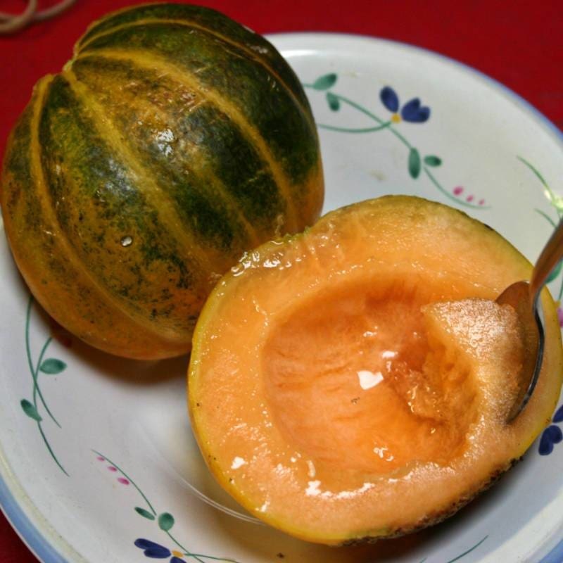 French Heirloom 1787. The Noir De Carmes Melon is a rare Heirloom preserved by the Carmelite monks of France. Has deep smooth ribs and skin so dark green that it is almost black but ripens to mottled orange. Aromatic flesh that is gently sweet. Grows 2-3 l