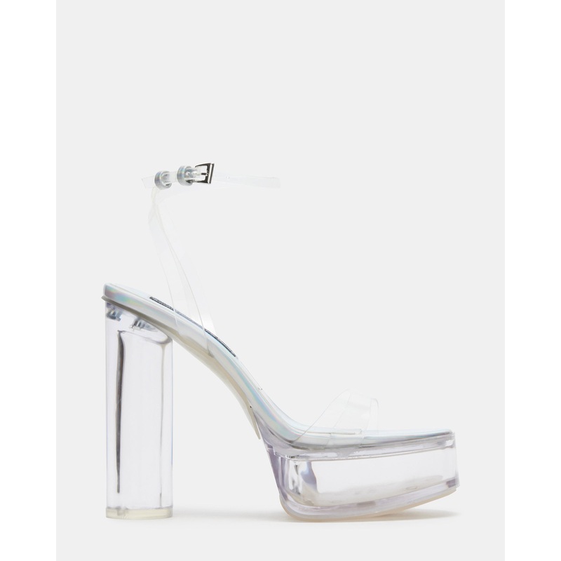 Elevate your style with NOVA heels, featuring a bold platform and block heel for added height and confidence. The Lucite material and iridescent detailing add a touch of adventure to any outfit. Jessica Rich | Steve Madden 5.25 inch heel height 1.75 inch p