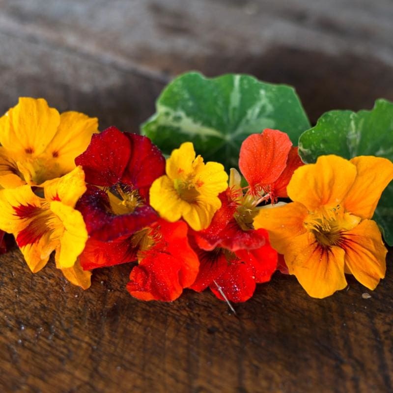 The vigorous, variegated foliage is spreading and covered with blooms in a variety of colors. A single spur type, the blossoms are a spicy addition to a salad.