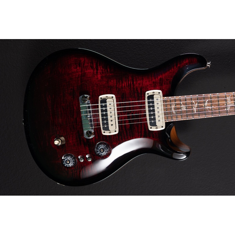 Vampire Mist, High gloss nitro finish, Violin carved figured Maple top, Mahogany body, Pattern carved Mahogany neck, 10″ radius Honduran Rosewood fingerboard with the Brushstroke Bird inlays, 25″ scale length, 1 11/16th” nut width, TCI bridge and neck pickups, 3-way toggle switching with the volume and tone controls plus the two mini-toggle coil tap switches, PRS stoptail bridge with the brass inserts, PRS Phase III locking tuners, 7.2 pounds, With hardshell case