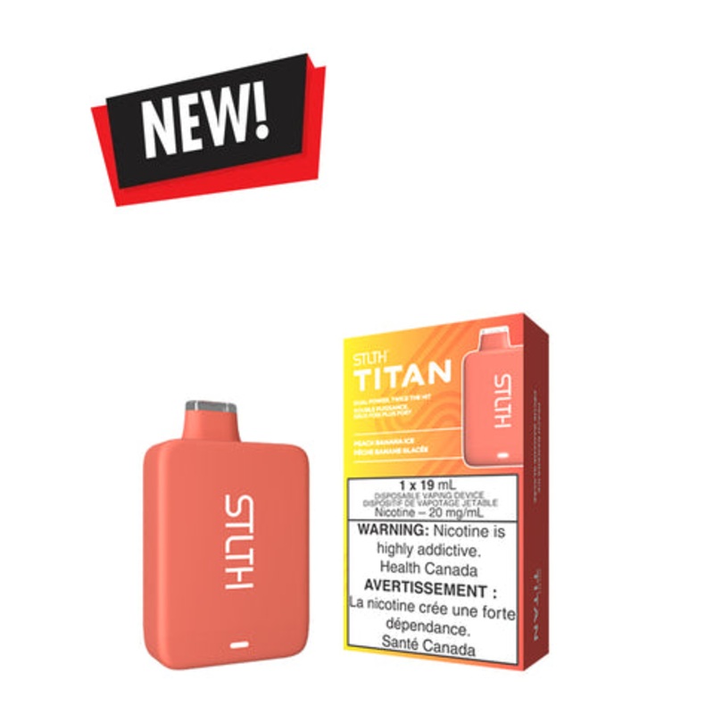 Peach Banana Ice STLTH TITAN DisposableHarmonious blend of ripe peaches and creamy bananas, finished by a refreshing icy touch for a tropical twist.______STLTH TITAN - DUAL POWER - TWICE THE HIT 19mL of E-Liquid Dual Coil Powered Rechargeable Battery Up to