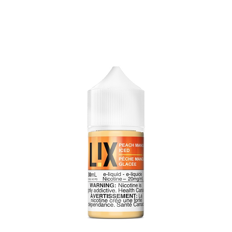PEACH MANGO ICED SALTS 30ML BY LIX The perfect harmony of white peaches and exotic mangoes, served over ice. PG/VG Ratio: 40/60 MSRP: 20$ (Plus applicable Excise Duty)