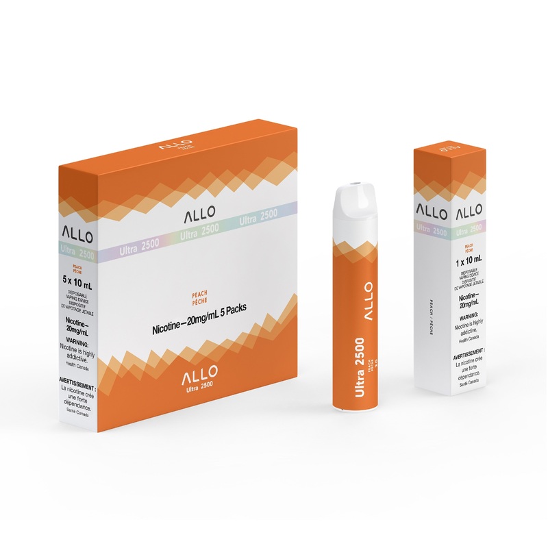 FLAVOR PROFILE Peach Allo UltraDisposable Vape Allo Ultra 2500 an all-in-one, ready to vape nicotine delivery system, designed to be disposed once empty. Specifications: Nicotine: 20mg Puff Count: Up to 2500 E-Liquid: 10mL Battery:1500mAh