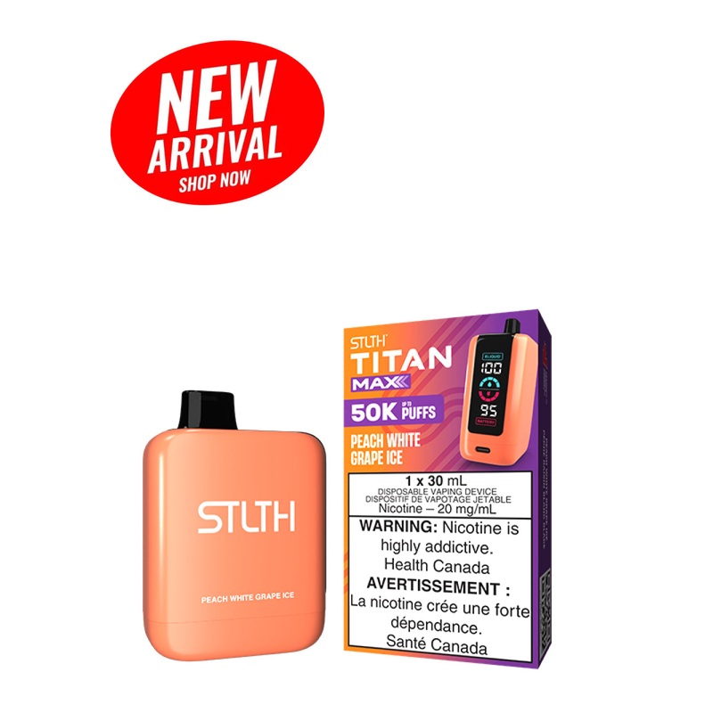 PEACH WHITE GRAPE ICE STLTH TITAN MAX DISPOSABLEA luscious fusion of juicy peach and sweet white grape, with a refreshing frosty twist that enhances the fruit forward flavours.______STLTH TITAN MAX - WITH MEGA SCREEN 1 box contains 1 Disposable Device 30mL
