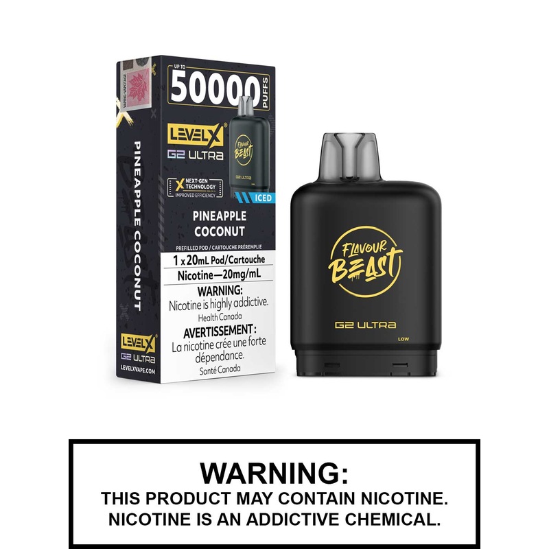 Push the limits of hybrid performance with the Pineapple Coconut Iced Flavour Beast Level X Ultra Pods – a next-level upgrade in the Level X vape family. Engineered for extended use, each Ultra pod delivers up to 50,000 puffs with a 20mL vape juice capacity, offering serious longevity and bold flavour in every draw.