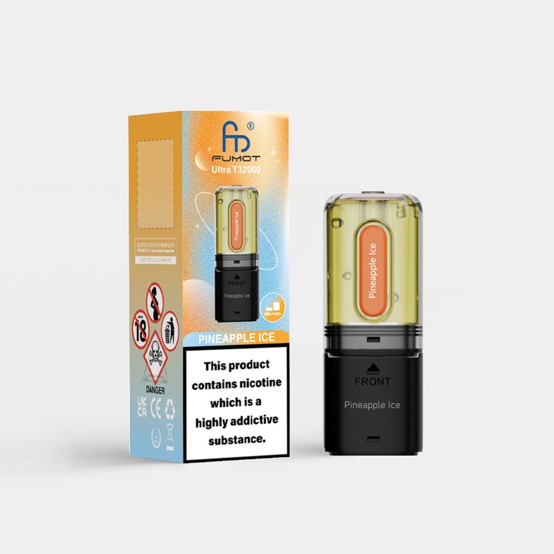 Fumot Ultra T32000 Pods Pineapple Ice Enjoy up to 16,000 puffs of vibrant flavour. Each pod includes 2ml + 10ml of e-liquid, combining juicy pineapple with a chilled exhale for a tropical cool-down.