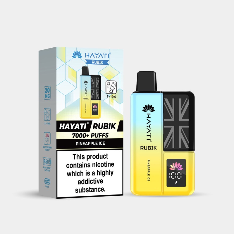 Hayati Rubik Pineapple Ice offers a Sweet and tropical pineapple with a frosty chill. Offering up to 7000+ puffs with smoother airflow and long-lasting flavour, it features an improved e-liquid delivery system with double cotton wicking for enhanced perfor