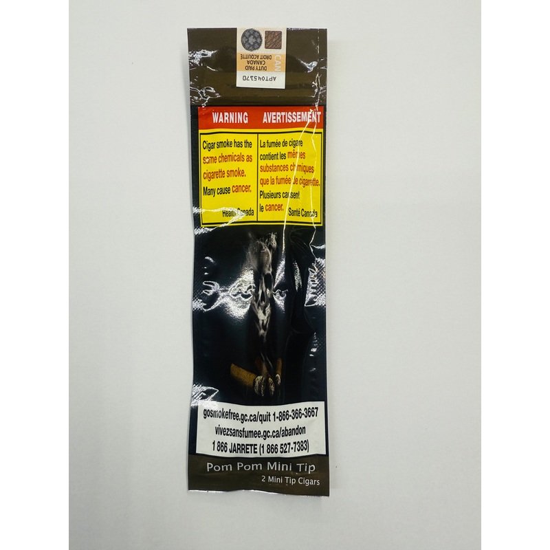 Brand: Pom Pom Contents: 2 Cigar per pack Tobacco: 100% natural tobacco Wrapper: Rustic natural leaf Flavor: Not labeled (flavored variants are restricted in Canada) Packaging: Plain, dark wrapping with health warnings (as per Canadian tobacco laws) Health
