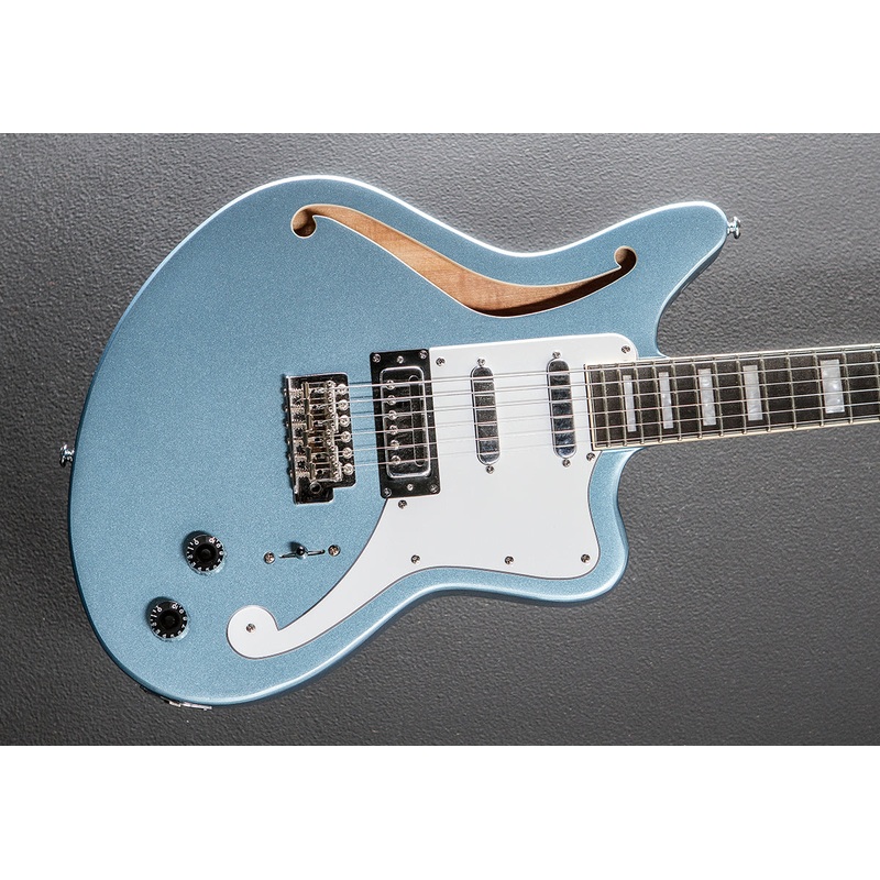 Very Good Condition, Ice Blue Metallic, Semi-hollow Basswood body with the center block, C shaped Maple Neck, Bound 14" radius Ovangkol fingerboard with the white pearloid block inlays and medium jumbo frets, 24.75" scale length, 1 11/16th" nut width, Dunc