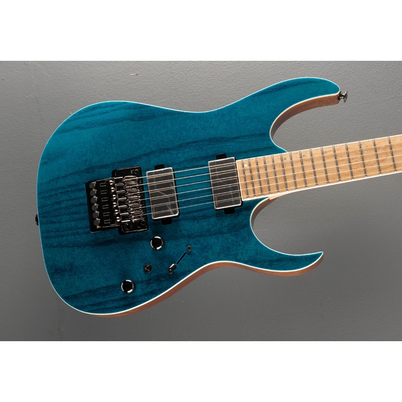 Frozen Ocean, Made in Japan, Ash top, African Mahogany body, Super Wizard HP shaped five piece Maple/Wenge neck, Bound 16.9" radius Birdseye Maple fingerboard with the off-set Mother of Pearl dot inlays and jumbo stainless steel frets, 25.5" scale length,