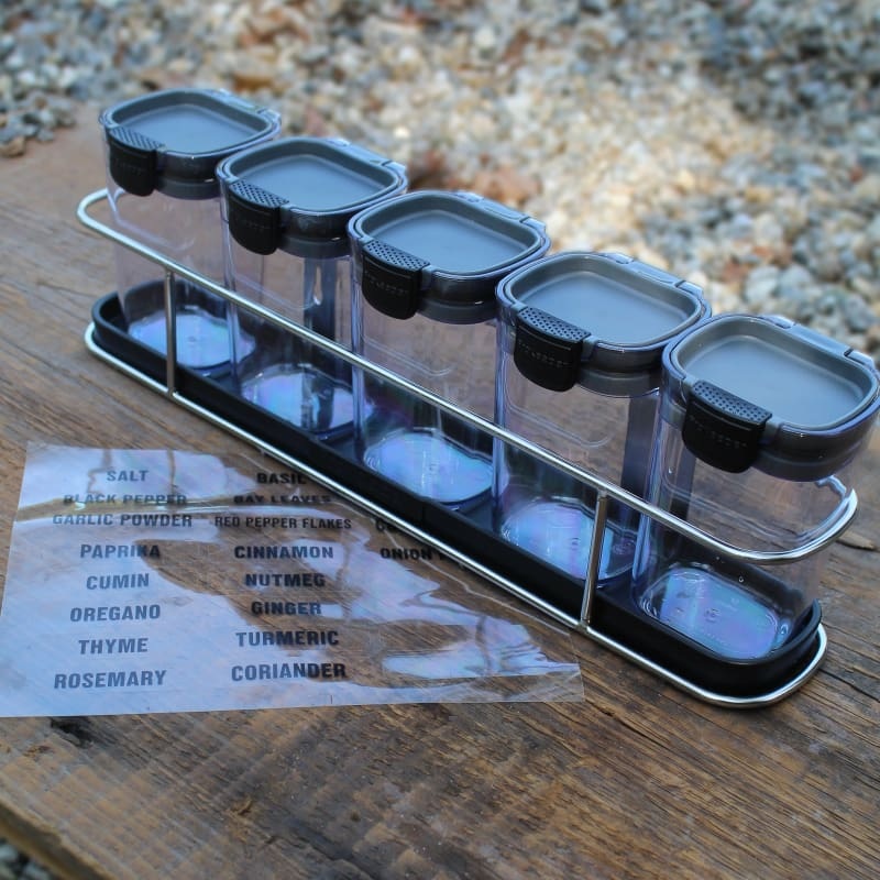 The ultimate spice storage solution for every kitchen. Includes 5 ProKeeper+ seasoning keepers and a mountable stainless steel spice rack (hardware included). Each keeper with a capacity of 5 oz. (147.9 ml), features an airtight silicone seal to keep spice
