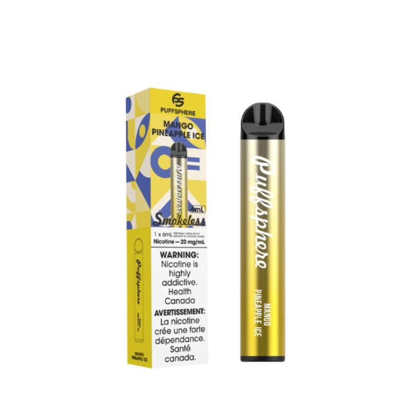PuffSphere Smokeless Mango Pineapple Ice Vape 2500 Puffs of Disposable Quality Flavour, New level of Discreetness. Flavour Profile: A vibrant mix of ripe mango and tangy pineapple, rounded off with an icy chill. Flavour Notes: Tropical Tangy Cooling The Pu