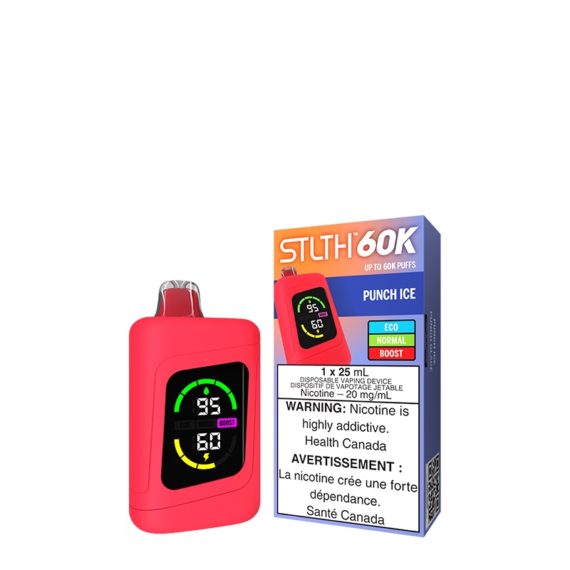 PUNCH ICE STLTH 60K DISPOSABLE (CARTON OF 4 UNITS) Unleash your taste buds with an explosion of tropical punch flavour, heightened by a refreshingly cool finish. ______ STLTH 60K - 3 MODES - ECO / NORMAL / BOOST 1 carton contains 4Disposable Devices 25mL o