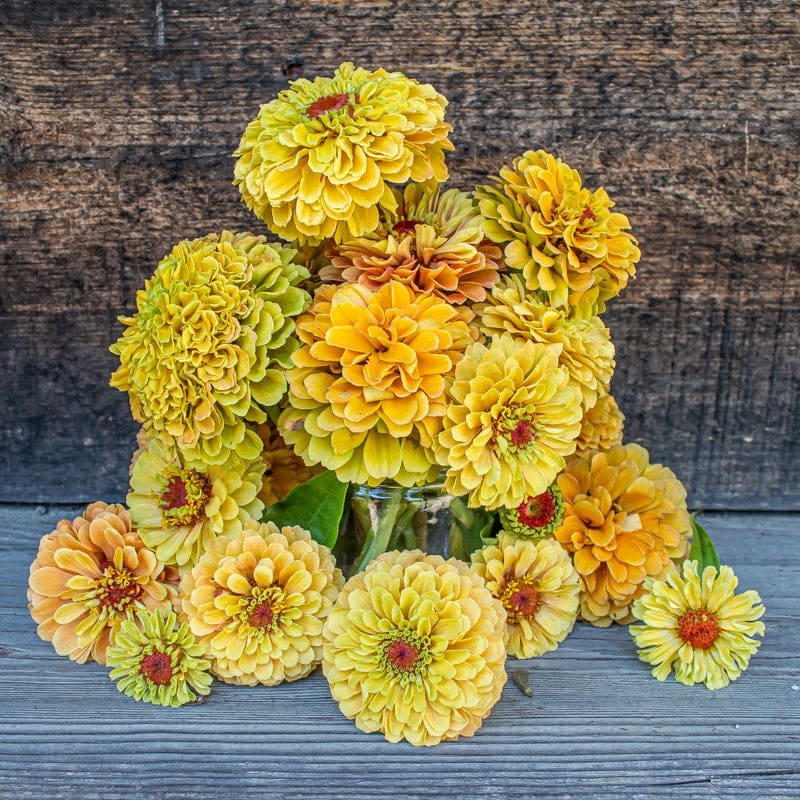Each flower has a slightly different variation of lemon and peach shades with raspberry-colored centers. The Queeny series is an outstanding new zinnia that outperforms the original standard. A mix of double, semi-double, or single, fade-resistant blossoms atop a sturdy, well-branching plant. One packet of seeds can supply you with a summer’s worth of cut flowers. Creates a captivating bouquet.
