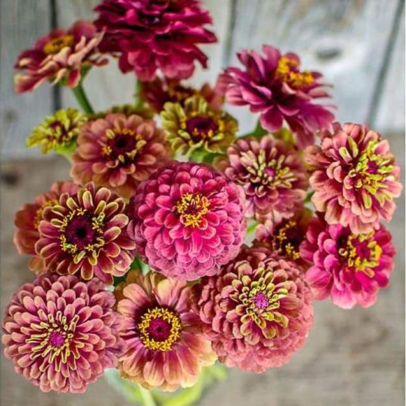 One of the most original and lovely zinnia colors we have seen. Each flower has a slightly different color variation; light burgundy to smokey pink with an undertone oflime green and raspberry colored centers. The Queen or Queeny series is an outstanding new zinnia that outperforms the original standard. This zinnia series has been renamed to Queeny recently. A mix of double, semi-double, or single, fade-resistant blossoms atop a sturdy, well-branching plant. One packet of seeds can supply you with a summer’s worth of cut flowers. Creates a captivating bouquet.A mixof full double semi and some single flowers, 2-3.