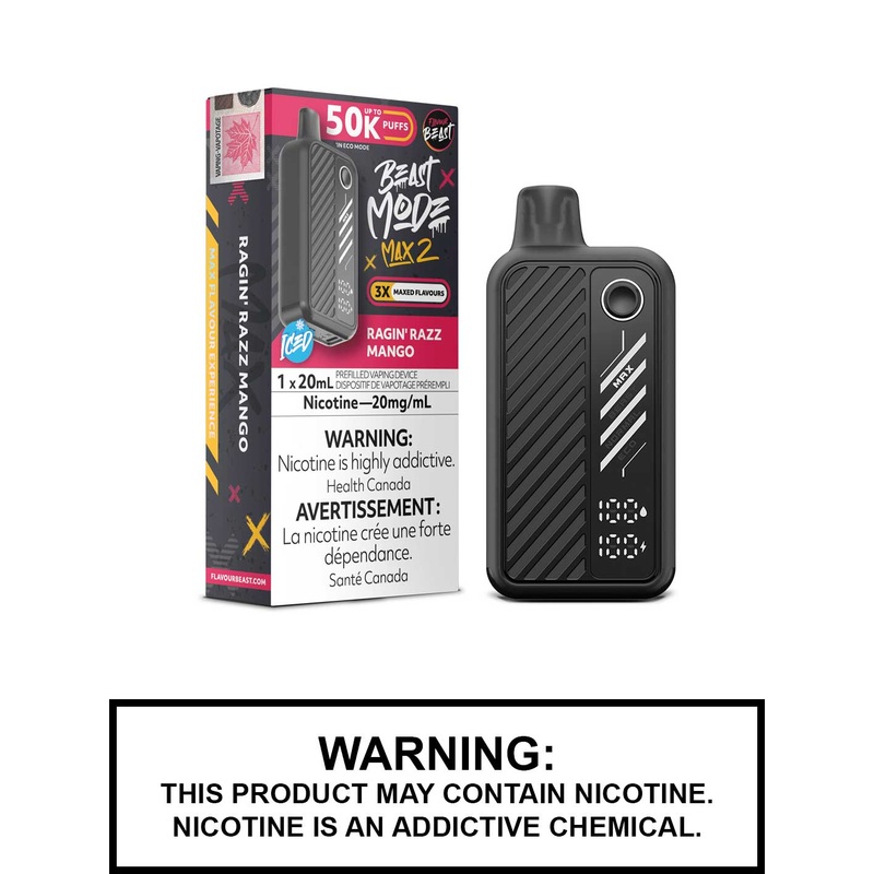 Unleash the power of the Ragin Razz Mango Iced Flavour Beast Beast Mode Max 2, the latest addition to the Flavour Beast vape family. Designed to deliver an extraordinary vaping experience, this disposable vape boasts 20mL of vape juice and up to 50,000 puffs in eco mode. With four unique firing modes, you decide how to enjoy your favourite Flavour Beast flavours. Whether youre in the mood for maximum puff counts or chasing dense clouds, the Beast Mode Max 2 adapts to every vibe.