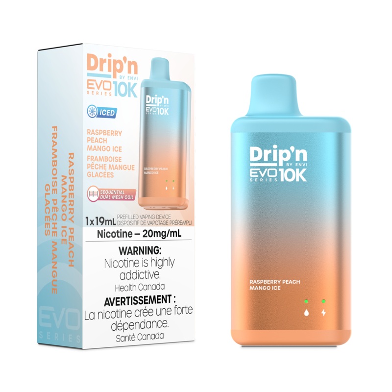Raspberry Peach Mango Ice by Drip’N Evo 10K combines the sweet and tangy flavors of ripe raspberries, juicy peaches, and tropical mangoes, all finished with a refreshing menthol exhale.