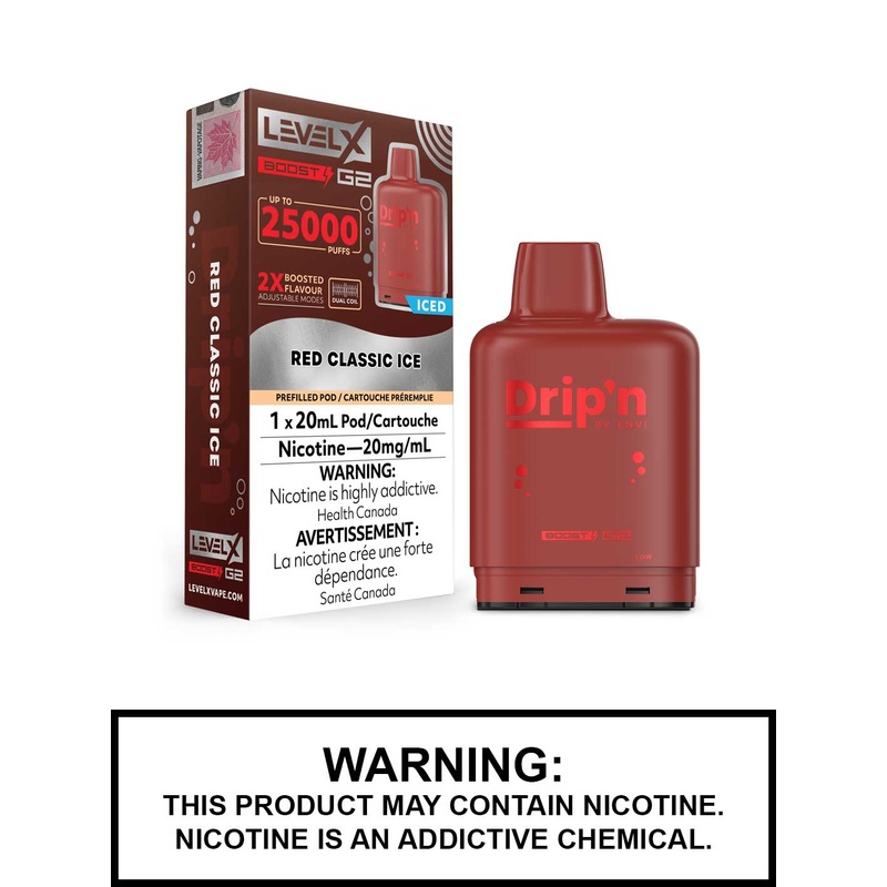 Introducing the Red Classic Ice Drip’n Level X Boost G2 Pods, the latest innovation in the Level X family. These pods feature an impressive 20mL capacity, delivering up to 25,000 puffs and setting a new benchmark for Level X pods. Compatible with the Level X Boost battery and the new Level X Boost G2 battery, the Level X Boost G2 pods offer three distinct firing modes: Eco Mode for up to 25,000 puffs of smooth, subtle flavour; Standard Mode for up to 15,000 puffs of rich, flavourful hits; and Boost Mode for up to 10,000 puffs of intense flavour and cloud production.