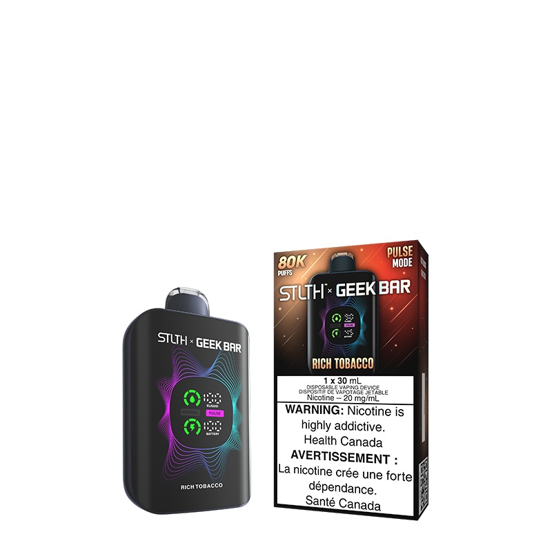 STLTH x GEEKBAR DISPOSABLE - RICH TOBACCO A strong, grounded blend of deep tobacco flavour with smooth intensity and lasting depth. ______ STLTH X GEEKBAR - WITH MEGA PULSE MODE 1 carton contains 4Disposable Devices 30mL of E-Liquid Adjustable airflow Mode