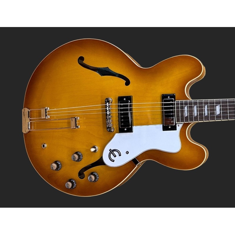 Royal Tan, Semi-hollow layered Maple body with a Maple centerblock, Rounded C shaped Mahogany neck,Bound 12 radius Indian Laurel fingerboard with the pearloid trapezoid inlays and medium jumbo frets, 24.72 scale length, 1.69 nut width, Epiphone Pro Mini Humbucker T bridge and Epiphone Pro Mini Humbucker R neck pickups, 3-way toggle switching with the volume and tone controls for each pickup, Epiphone LockTone tune-o-matic bridge and Frequensator tailpiece, Epiphone vintage deluxe tuners, Case not included