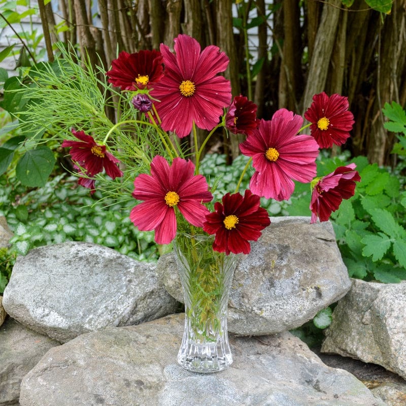 The dark cranberry flowers of Rubenza Cosmos fade in color as they mature into a dusty mauve shade. Another excellent addition to grow in your cutting garden. Early flowering and productivity. Grows 36-48.