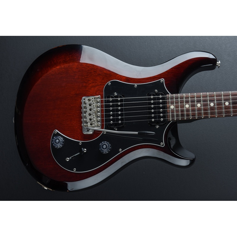 Very Good Condition, Scarlet Sunburst, Mahogany body with an asymmetric beveled top, Pattern Regular carved Mahogany neck, 10 radius Rosewood fingerboard with the Dot inlays, 25 scale length, 1 11/16th nut width, PRS 58/15 S bridge and neck pickups, 3-way