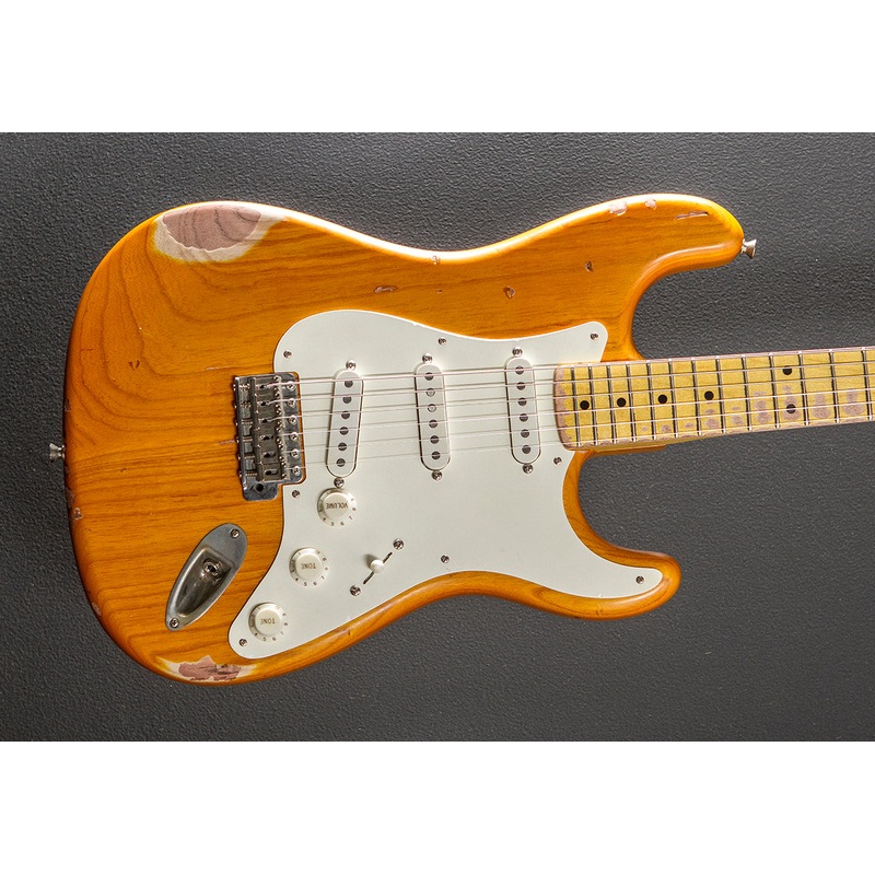 Amber, Heavy aged body finish, Ash body, C shaped Maple neck with a 10″ radius Maple fingerboard and medium jumbo frets, 25.5 scale length, 1 5/8th nut width, Lollar/Nash Special S bridge and Lollar Blonde S middle/neck pickups, 5-way switching with the volume/tone/tone controls, Vintage style tremolo with the bent steel saddles, Vintage style tuners, 7.6 pounds, With hardshell case