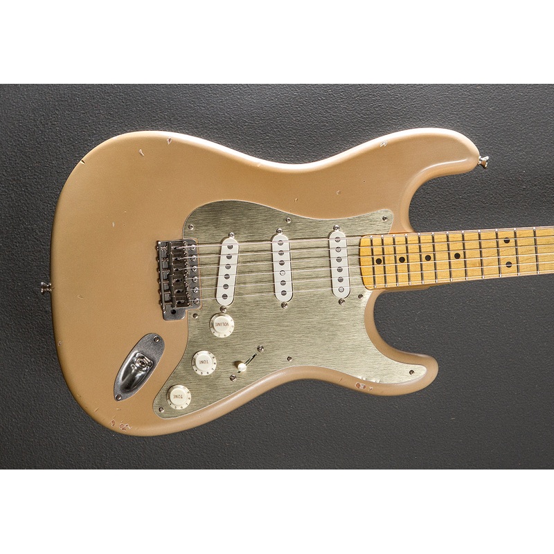 Desert Sand, Light aged body finish, Alder body, C shaped Maple neck with a 10″ radius Maple fingerboard and medium jumbo frets, 25.5 scale length, 1 5/8th nut width, Lollar/Nash Special S bridge and Lollar Blonde S middle/neck pickups, 5-way switching with the volume/tone/tone controls, Vintage style tremolo with the bent steel saddles, Vintage style tuners, 8.0 pounds, With hardshell case