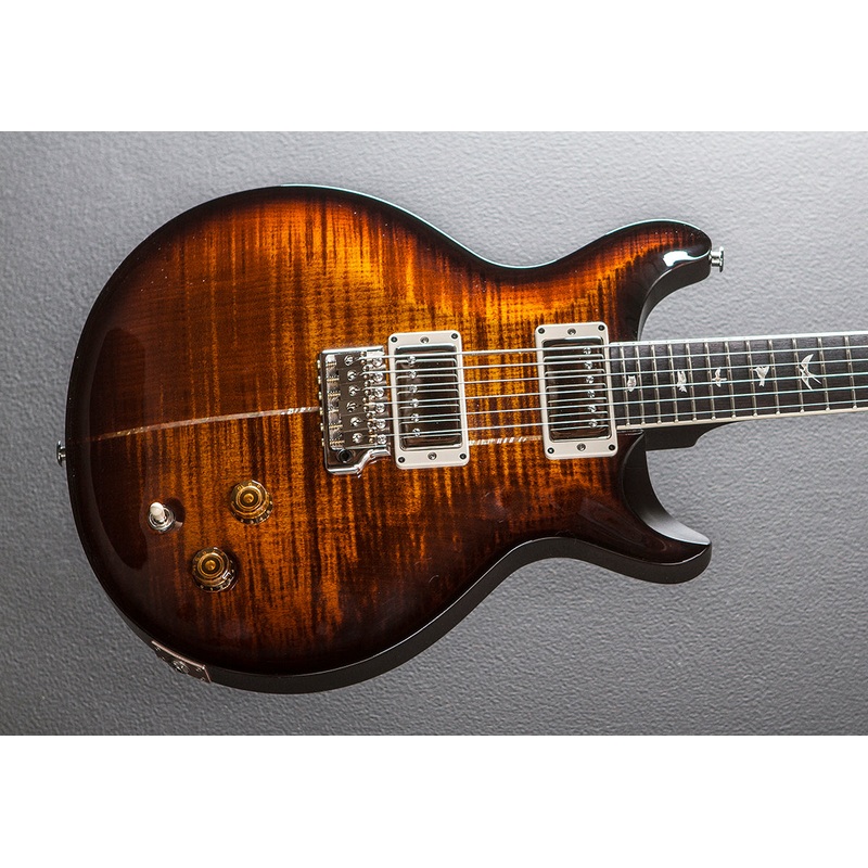 Black Gold Burst, Gloss finish, Violin carved figured Maple top, Mahogany body, Santana Retro carved Mahogany neck, Bound 10 radius Rosewood fingerboard with the Bird inlays, 24.5 scale length, 1 11/16th nut width, Santana bridge and neck pickups, 3-way to
