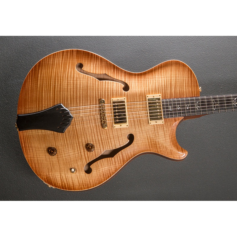 ON HOLD for trades - CS/LB - 10/8/25 Vintage Natural, Gloss finish, 17" wide by 1 7/8th" deep hollow body, Violin carved Flame Maple top and back, Mahogany body rim, Wide/Fat carved Mahogany neck, 10" radius Macassar Ebony fingerboard with the Bird inlays,