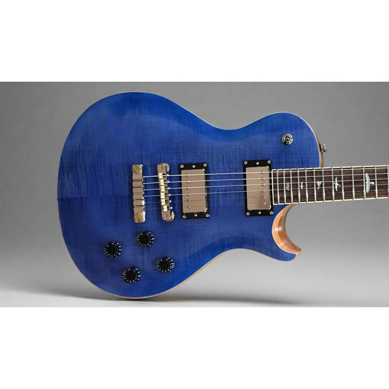 Faded Blue, Shallow violin carved Maple top with a Flame Maple veneer, Pattern Vintage carved Mahogany neck, Bound 10" radius Rosewood fingerboard with the Bird inlays, 24.594 scale length, 1 11/16th" nut width, 58/15 LT "S" bridge and neck pickups, 3-way