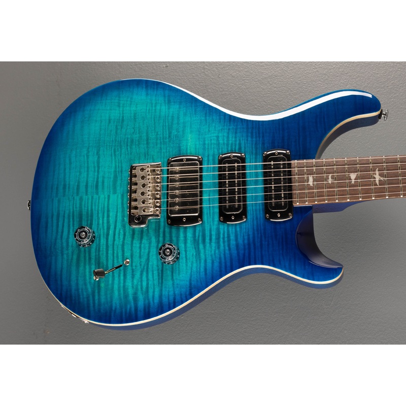 Excellent Condition, Lake Blue, Mahogany body, Shallow Violin Carved Maple cap with a Figured Maple veneer, 10" radius Rosewood fingerboard with bird inlays on a Wide Thin carved Maple neck, 1 11/16" nut width, 25" scale length, 58/15 S bridge and Narrowfi