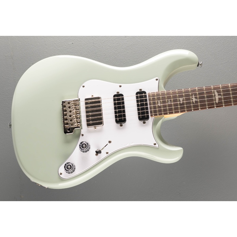 Very Good Condition, Sage Green, Flat Top Mahogany body, 10" radius Rosewood fingerboard with bird inlays on a Wide Thin carved Maple neck, 1 11/16" nut width, 25" scale length, 58/15 S bridge and Narrowfield DD S Neck/Middle pickups, 5 way switching with