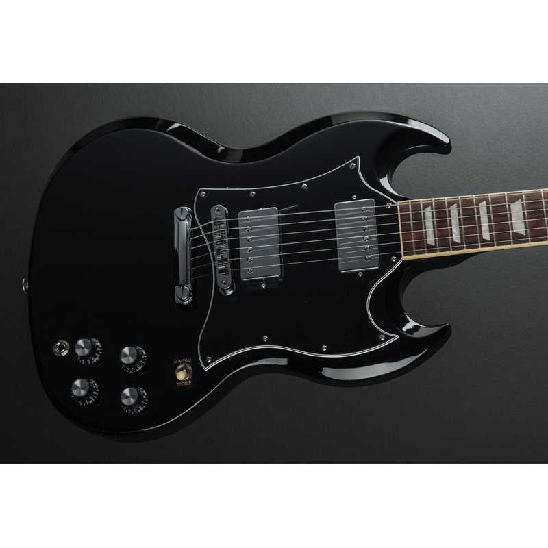 “The Gibson SG Standard rocks the classic looks and features associated with the late 60’s style SG models sought after by many. A rounded profile mahogany neck, bound rosewood fingerboard, long tenon 19th fret neck joint, and a solid mahogany body provide the backbone for singing sustain. The 490R and 490T Alnico II pickups provide the power to drive. A black, 5-ply, full-face pickguard set this SG Standard apart from others… a truly versatile classic.”