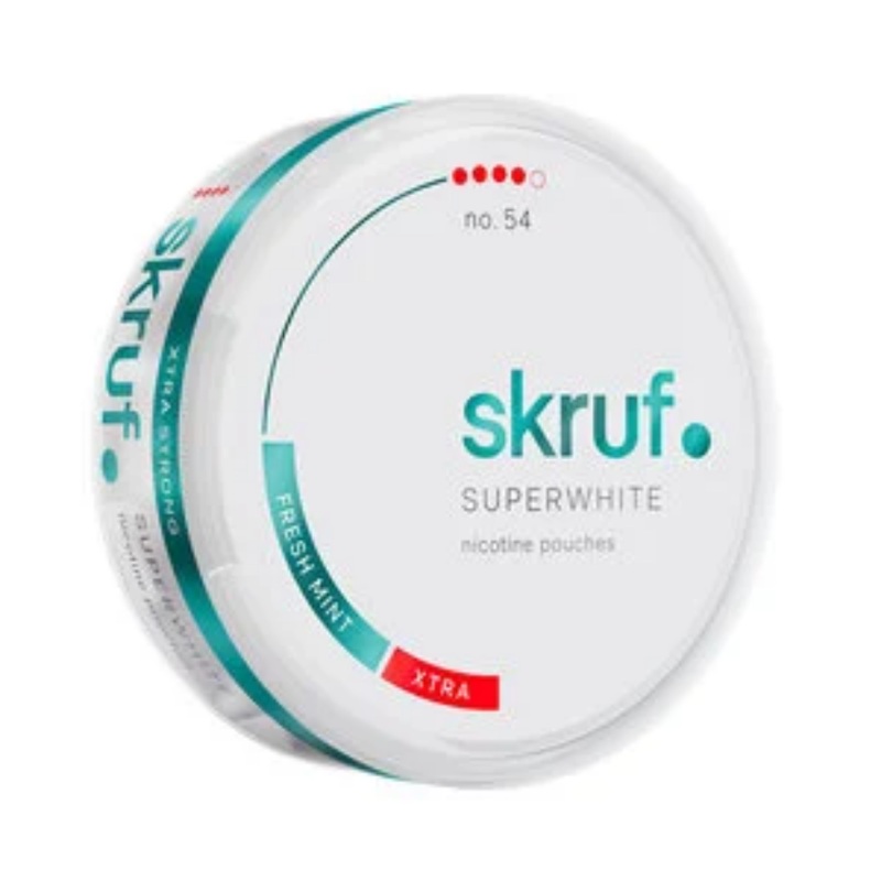Choose Skruf Superwhite No. 54 Fresh Mint Xtra for a bold and invigorating mint experience that delivers strong nicotine satisfaction with every pouch.